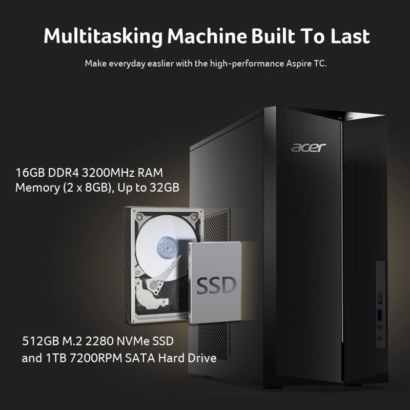 16GB 3200MHz DDR4 内存 | 512GB M.2 2280 NVMe SSD | 1TB 7200RPM SATA 硬盘 | 8X DVD-刻录机双层驱动器 (DVD-RW)